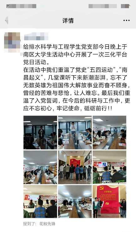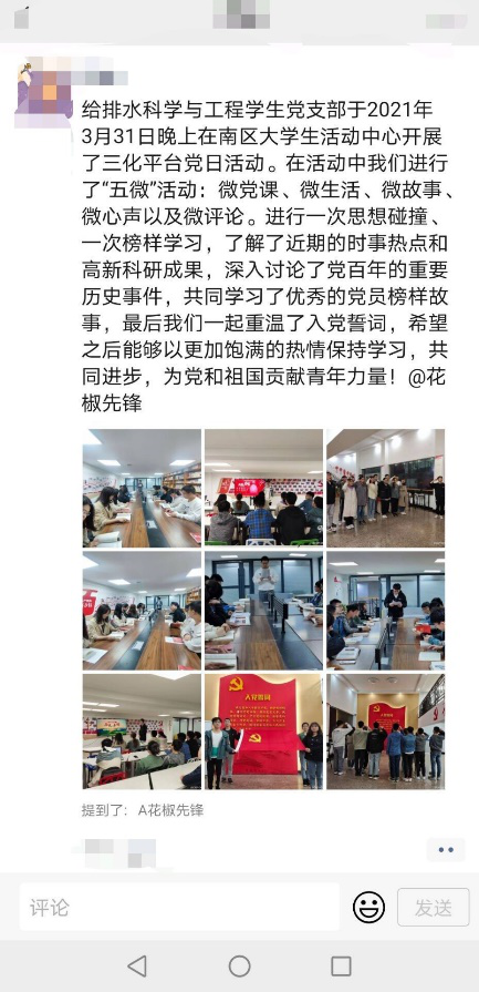 2021年4月2日,土建学院给排水科学与工程学生党支部在支部副书记倪主业同志的带领下,在南区学生一站式服务中心开展了以“学党史以铭志,守初心以志远”为主题的党日活动,以实际行动向建党一百周年献礼。活动以“五微”的形式进行,分别为关于党史的微党课、对于时事讨论的微评论、围绕优秀党员的微故事、重温入党誓词的微生活以及活动分享的微心声。活动期间,大家积极参与、踊跃发言。借此学习机会重温党史,肩负起历史使命,增强党员意识,深刻党员思想!