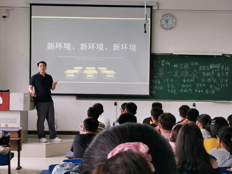 在新生入学班会开始前,带班党员龚友带动新生做自我介绍,相互认识后,刘伟老师用三个“新环境”为这次班会拉开序幕。