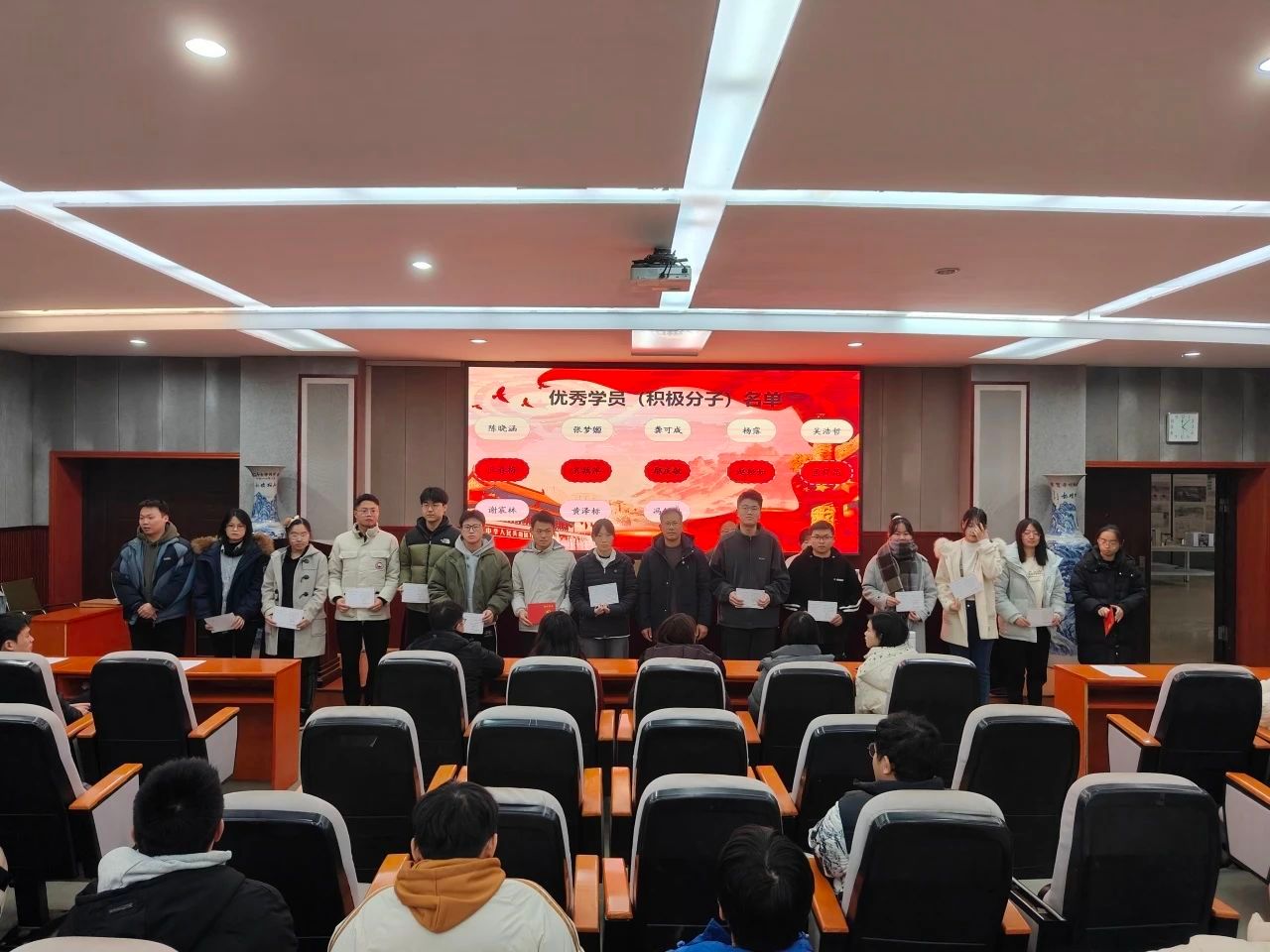 仪式在齐唱国歌中拉开序幕,刘琦慧老师宣读了优秀学员名单,刘永胜书记与优秀学员合影留念。