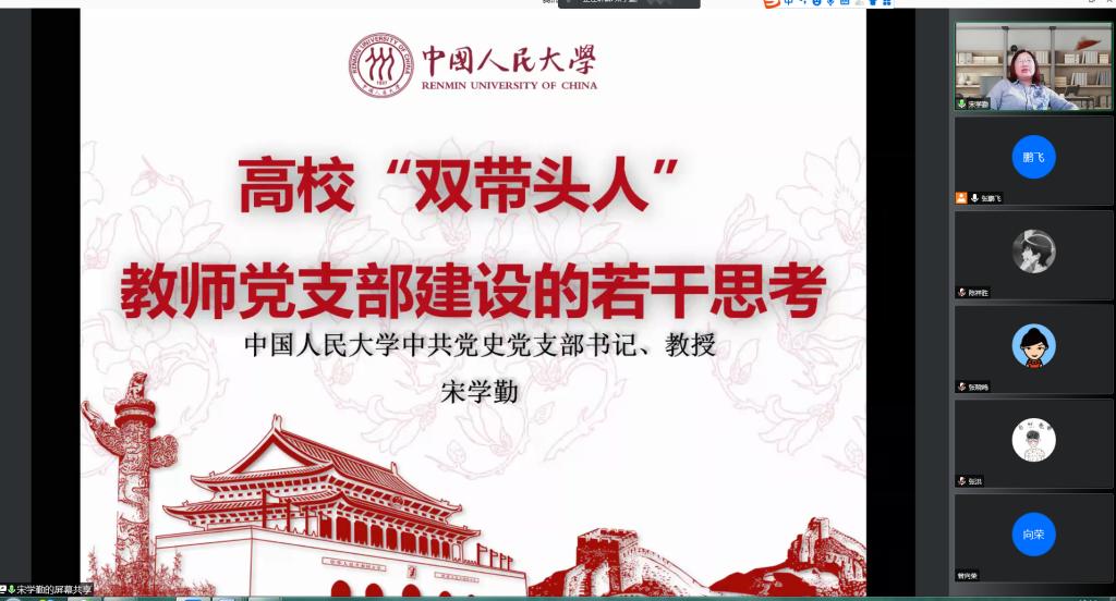 8月24日,我支部邀请中国人民大学马克思主义学院宋学勤教授给教师学生党员做了题为《百年大党的历史担当》的报告。报告会采用腾讯会议线上进行。