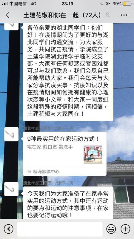 通过湖北籍学生临时党支部,引导湖北籍学生在家锻炼,坚持打卡。