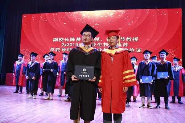 土建学院相关教师为毕业生颁发学位证书,陈梦成、徐长节共同为毕业生扶正流苏,并合影留念。