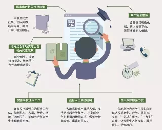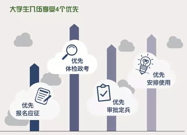 大学生享受优先报名应征、优先体检政审、优先审批定兵、优先安排去向的“四优先”政策,随到随检、不单科淘汰、合格的全部定兵。大学毕业生选定服役方向时优先考虑本人意愿。