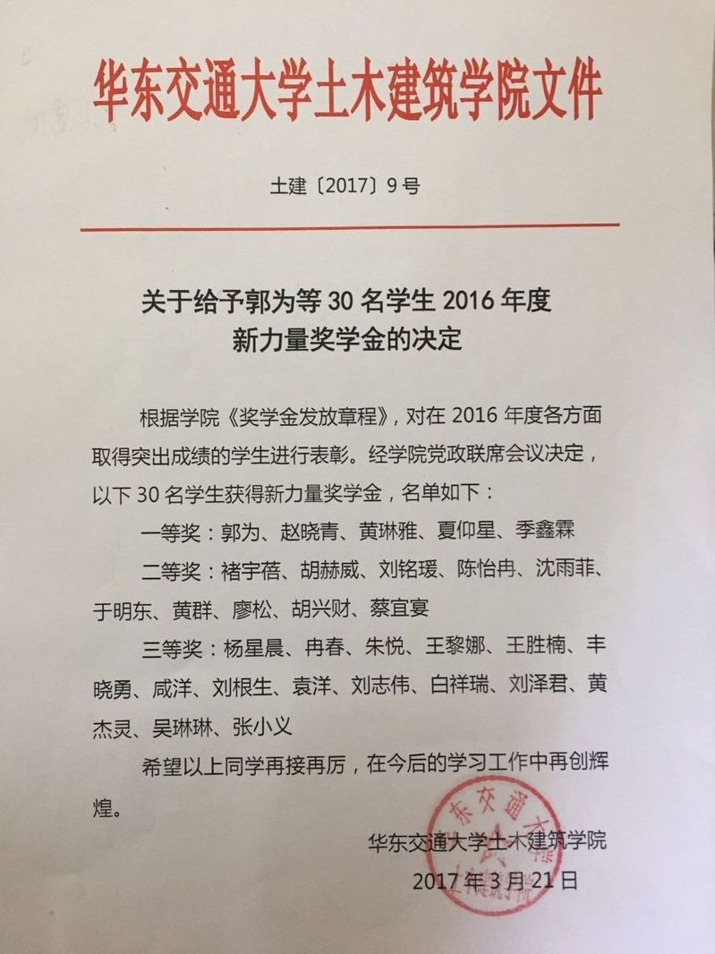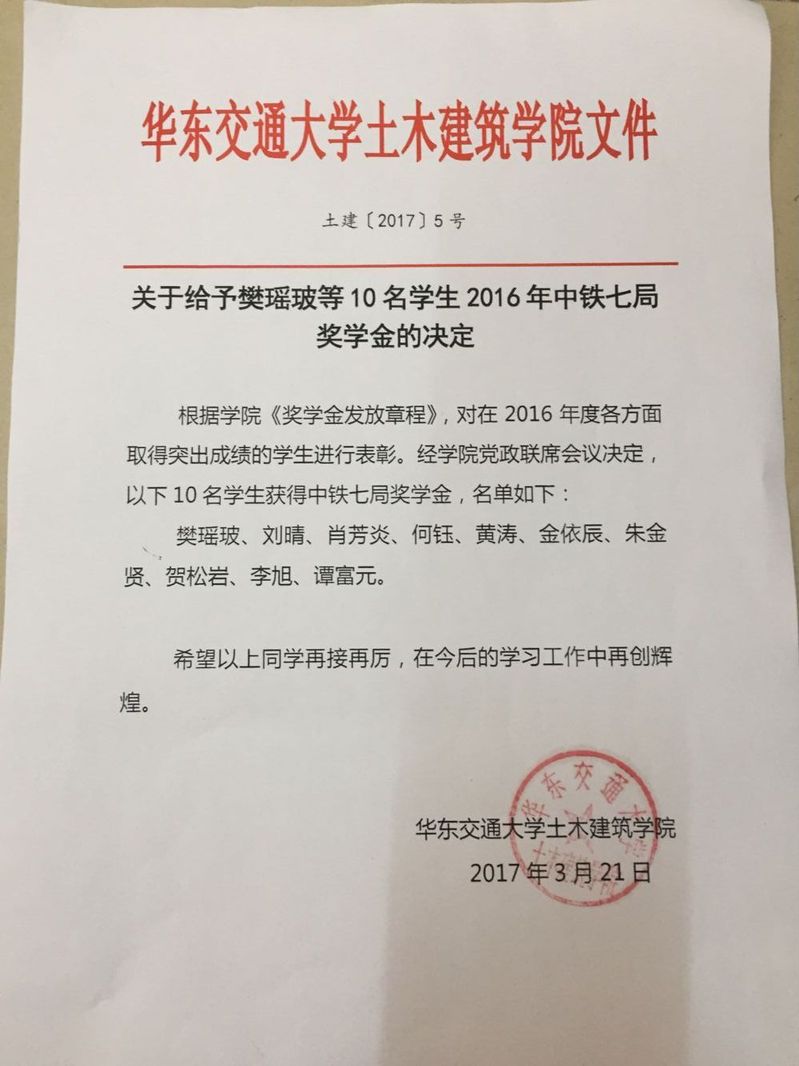 2016中铁七局奖学金名单