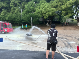 演练伊始,郑轶书记表示本次消防演练的目的是强化师生的消防意识,熟悉掌握消防知识和提高对火灾的处理能力。他指出,保证消防安全需要不断提高四方面的能力:检查消除火灾隐患能力、扑救初起火灾能力、组织人员疏散逃生能力、消防安全教育培训能力。郑轶书记向师生讲解了消防安全相关知识,火灾种类,分享了冷却、抑制、隔离和窒息4个扑灭火灾的方法。