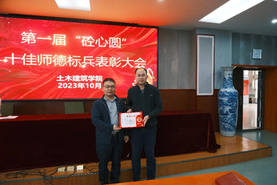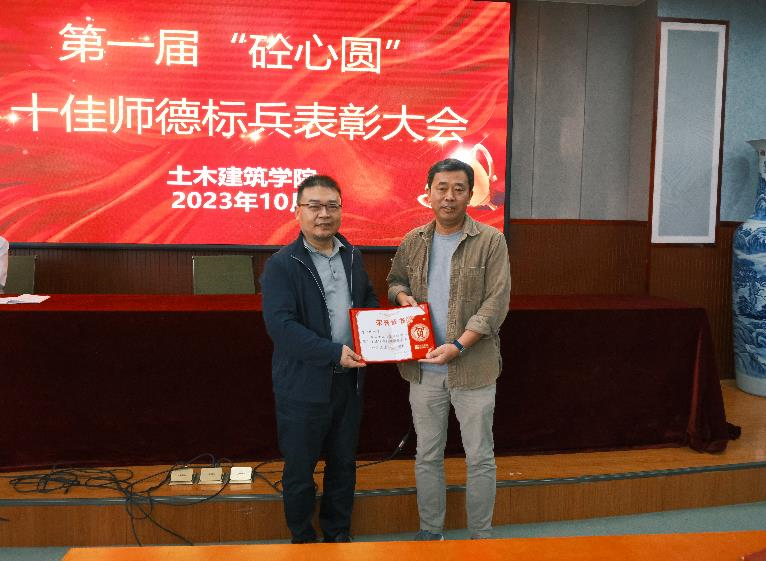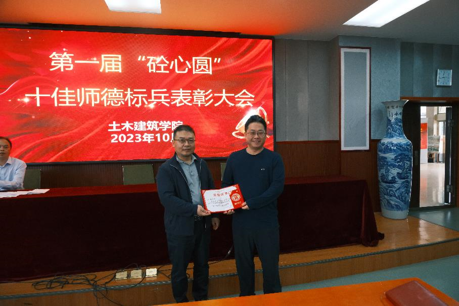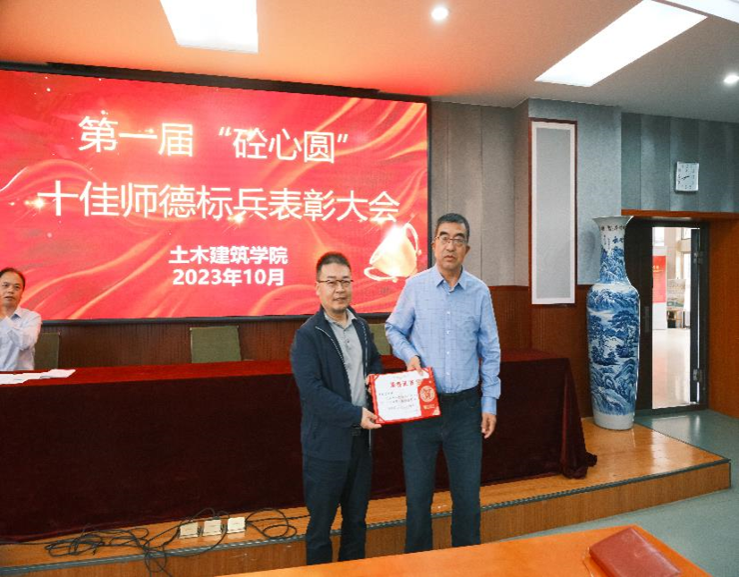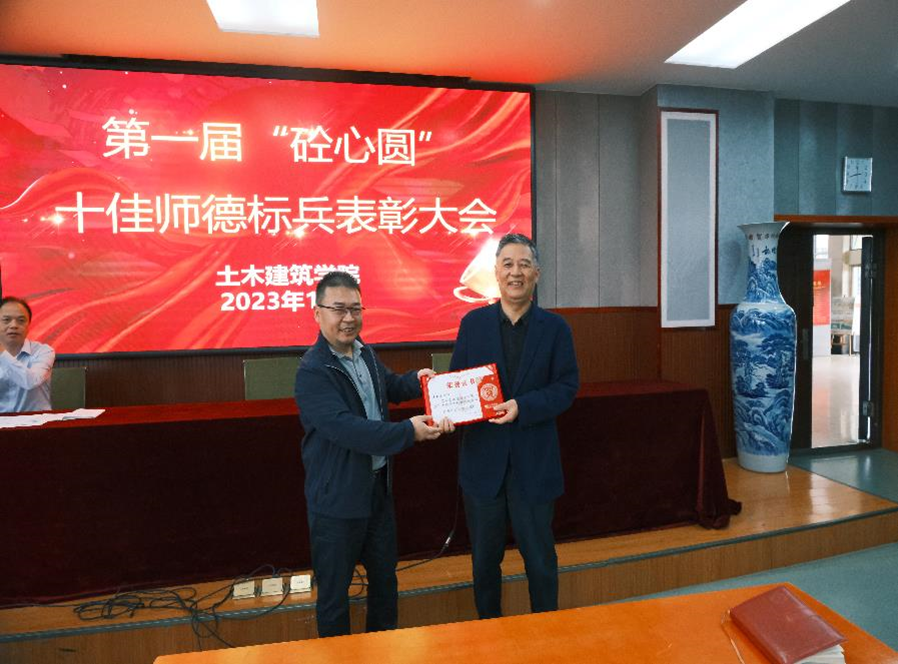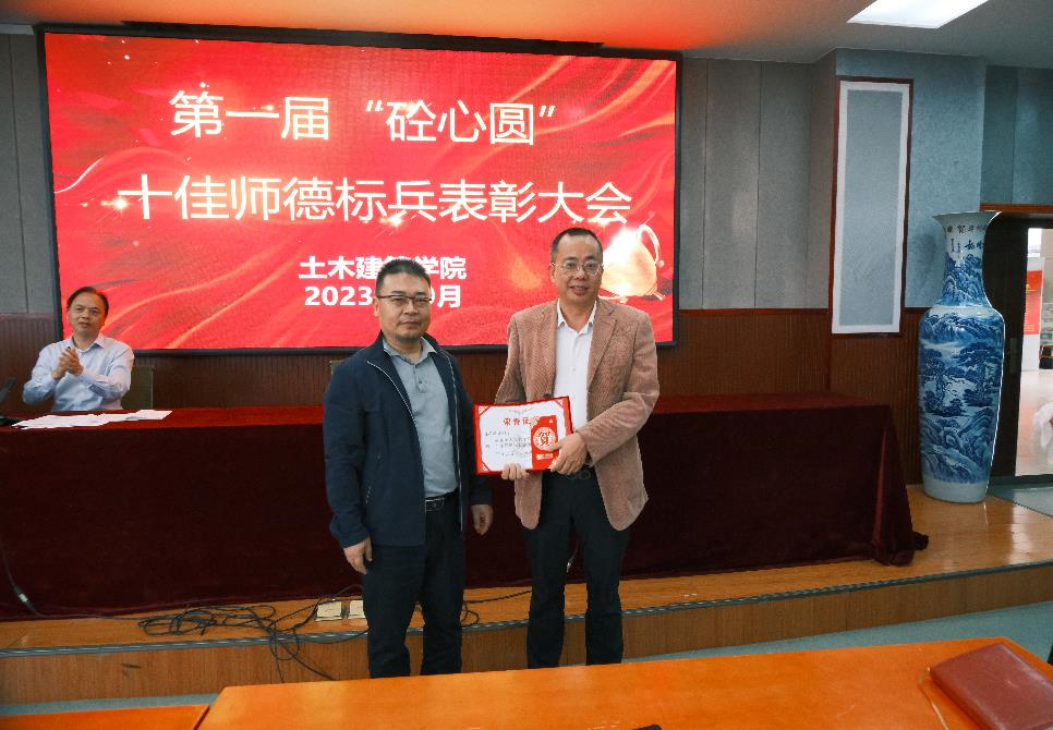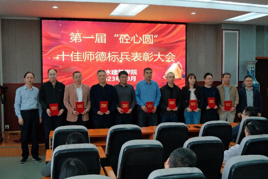 第一届“砼心圆”十佳师德标兵表彰的决定》,王永祥、许开成、麻宏强、万雯怡、程海根、唐朝春、鲁秀国、石钰锋、陈莘莘、李一晖共十位老师荣获土建学院第一届“砼心圆”十佳师德标兵荣誉称号。陈水生书记指出,学院开展师德标兵评选表彰,旨在表扬先进,树立榜样,激励广大教职工员爱岗敬业,涵养高尚师德,潜心立德树人。