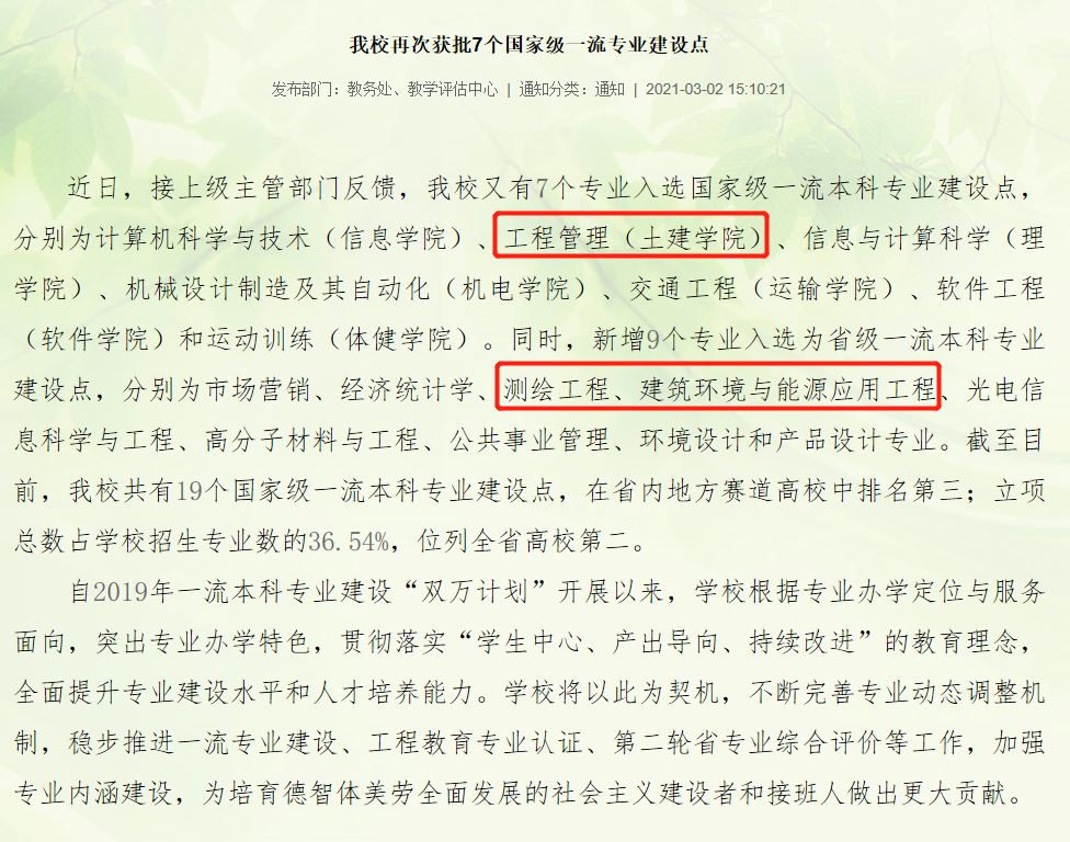 工程管理专业成功入选国家级一流本科专业建设点,同时,测绘工程、建筑环境与能源应用工程专业入选省一流本科专业建设点,入选数量全校第一。