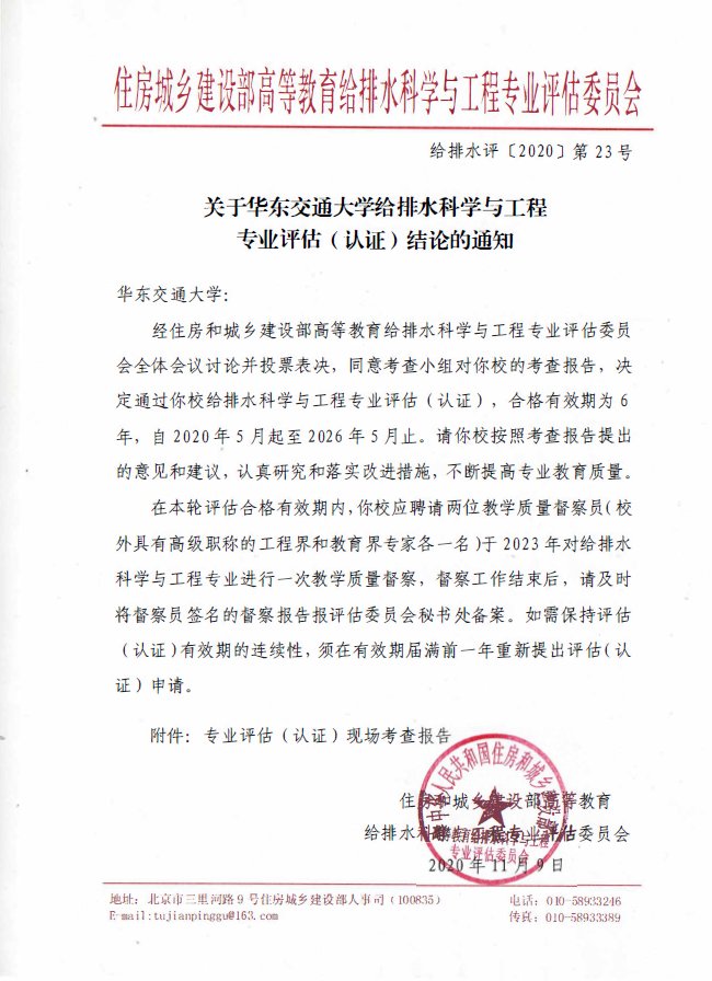 2020年11月8日,住房和城乡建设部高等教育给排水科学与工程专业评估委员会向我校发送了《关于华东交通大学给排水科学与工程专业评估(认证)结论的通知》(给排水评〔2020〕第23号)。经住房和城乡建设部高等教育给排水科学与工程专业评估委员会全体会议讨论并投票表决,同意考查小组的考查报告,决定通过华东交通大学给排水科学与工程专业评估(认证),合格有效期为6年,自2020年5月起至2026年5月止。