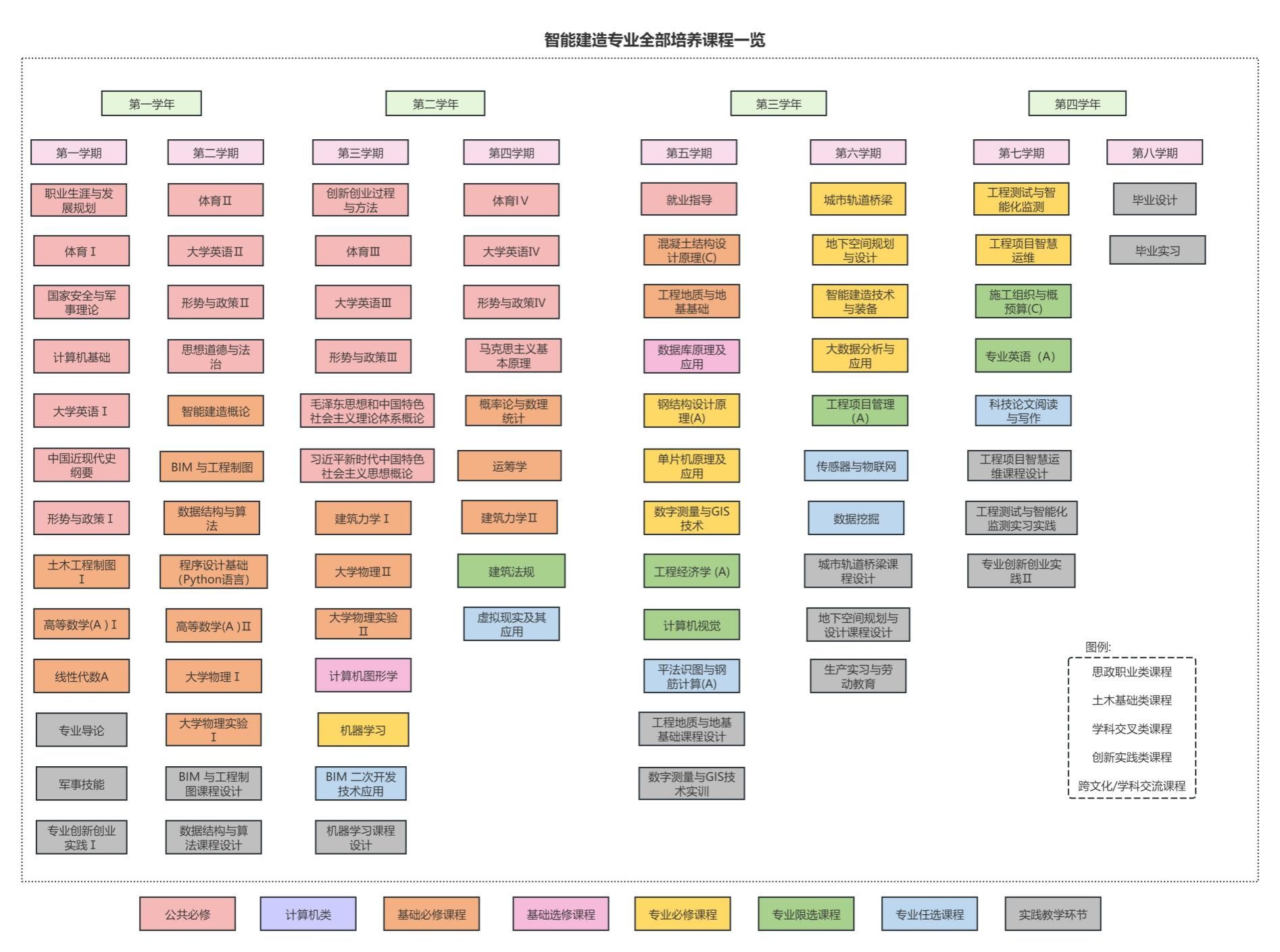 城市轨道桥梁课程设计、工程项目智慧运维课程设计、工程测试与智能化监测实习实践、BIM与工程制图课程设计、地下空间规划与设计课程设计、工程地质与地基基础课程设计、数据结构与算法课程设计、机器学习课程设计、数字测量与GIS技术实训、生产实习与劳动教育、毕业实习、毕业设计。