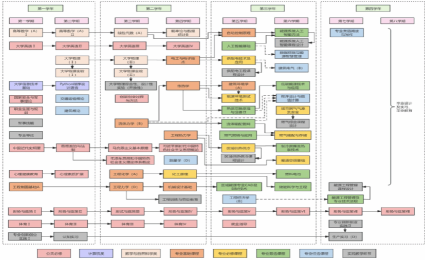 冷热源工程(4学分)、可再生能源利用技术(2学分)、城镇燃气应用(2学分)、建筑环境测试技术(A)(2学分)、暖通空调(5.5学分)。