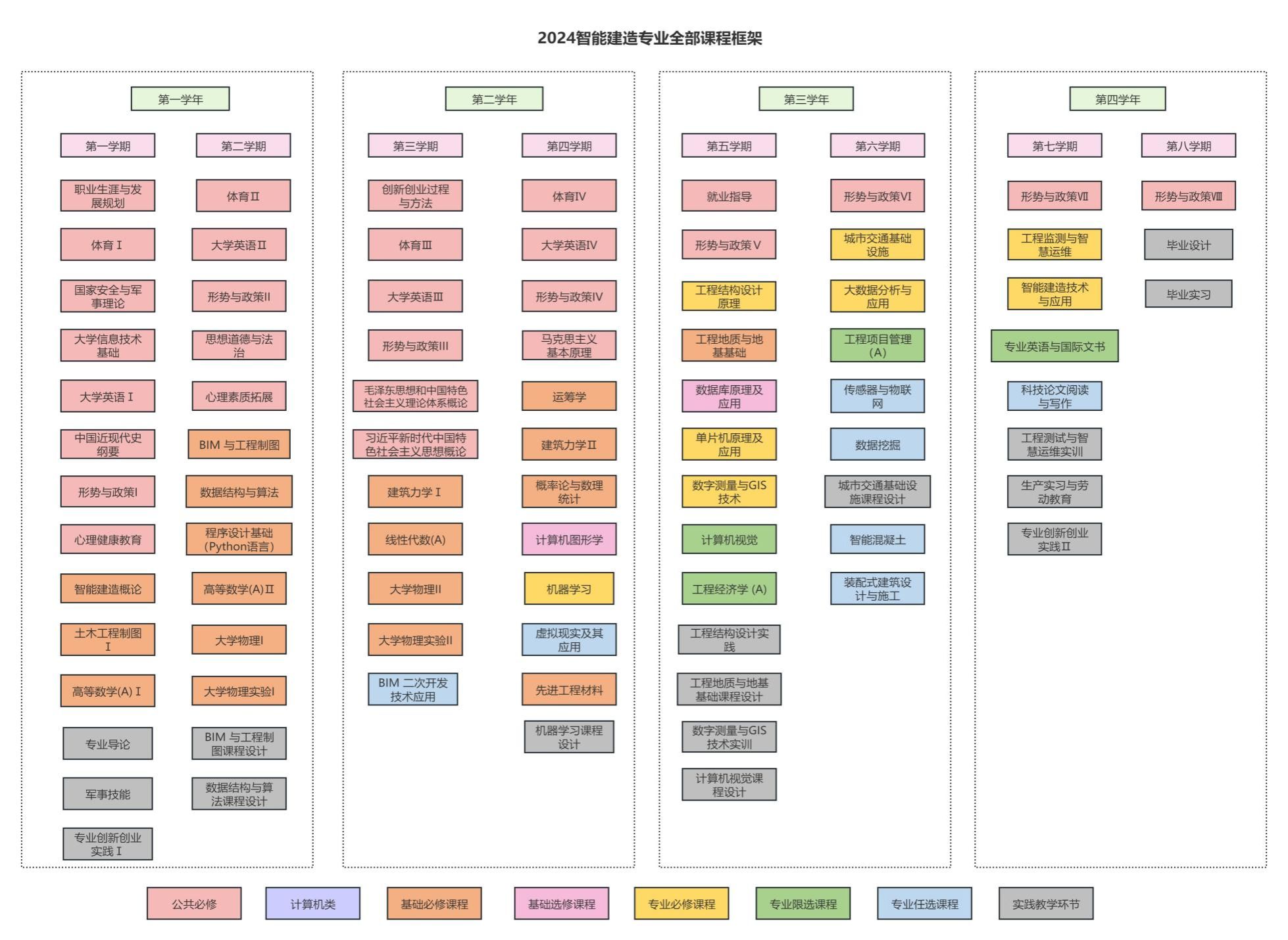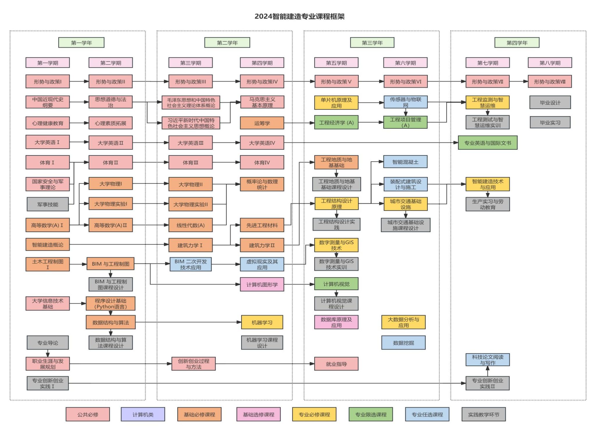 工程结构设计原理、先进工程材料、智能建造概论、BIM与工程制图、工程地质与地基基础、数据结构与算法、城市交通基础设施、智能建造技术与应用、工程监测与智慧运维、机器学习、数字测量与GIS技术、大数据分析与应用、工程项目管理、计算机视觉。