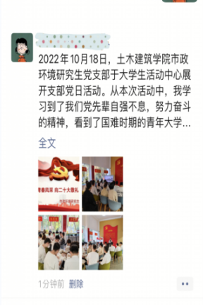市政环境研究生党支部全体党员对党史、党章、党的精神有了更深入的了解。用党的奋斗历程和伟大成就鼓舞斗志、明确方向;用党的光荣传统和优良作风坚定信念、凝聚力量;用党的实践创造和历史经验启迪智慧、砥砺品格。全体党员以崭新的青春面貌和风采向中国共产党第二十次全国代表大会敬礼,以更加昂扬的姿态为全面建设社会主义现代化国家新征程而奋斗!