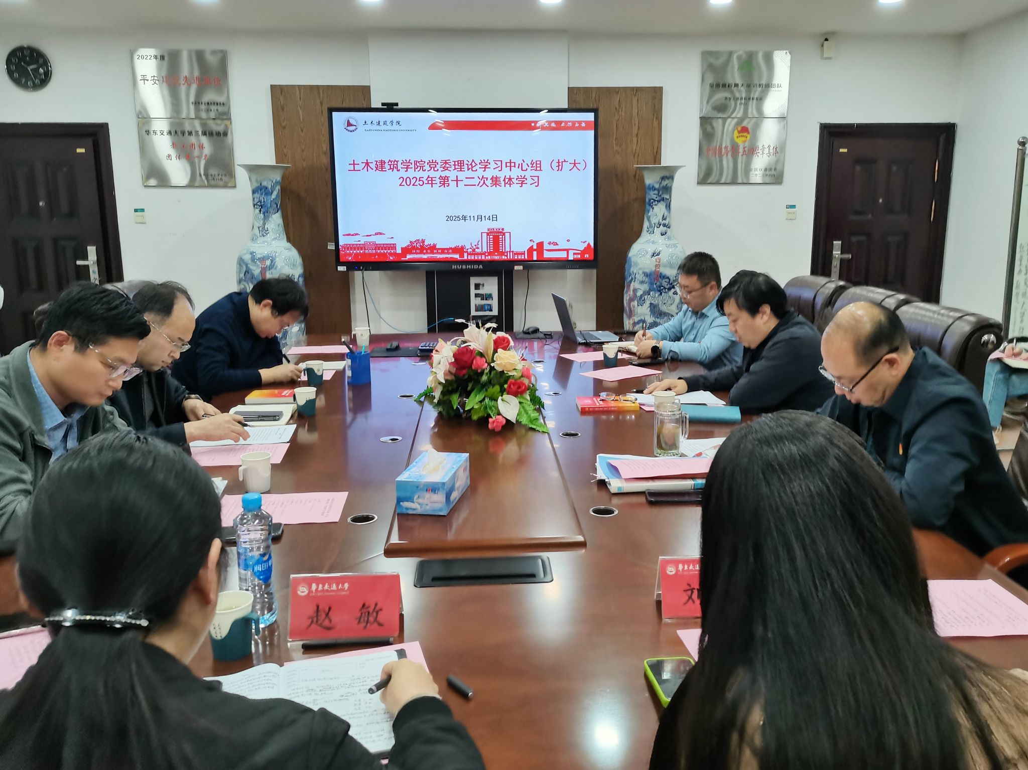 党委理论学习中心组举行2025年第十二次集体(扩大)学习会,专题学习党的二十届四中全会精神,会议由院长庄海洋主持,院党委委员、院班子成员、各党支部书记参加会议,电气学院党委书记赵敏、党委组织员刘佳列席旁听。