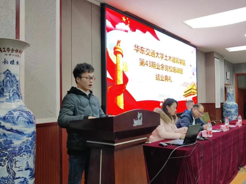 2020年11月27日下午,第43期业余党校培训班结业典礼在土建楼200举行。出席本次结业典礼的有院党委副书记兼分党校副校长郑轶老师、院学工办主任兼团委书记闫伟老师、院党委组织员兼党员教育管理中心负责人万雯怡老师及本期培训班学员。