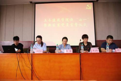 在“七﹒一” 建党节来临之际,土建学院党委于6月27日下午3点30分在土建楼会议厅200举行入党宣誓仪式。院党委书记李立玲、院党委副书记程浩、学工办主任兼团委书记闫伟、院党委组织员万雯怡等出席仪式,与会者还有各学生党支部书记。党委组织员万雯怡主持仪式,全体2017年上半年新发展党员参加仪式。