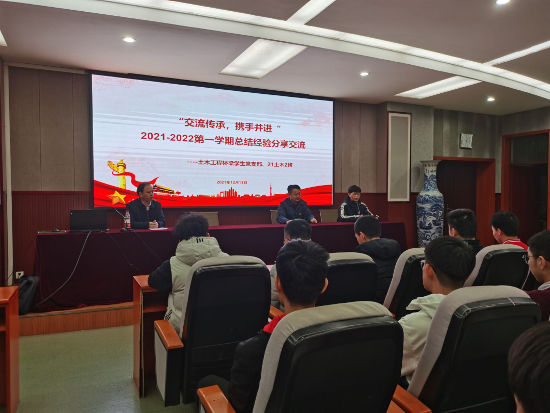 2021年12月13日下午,土木工程桥梁学生党支部与2021级土木工程2班在土木楼200报告厅开展了以“交流传承,携手并进”为主题的分享交流会。出席会议的领导老师有土建学院党委书记陈水生、土木工程桥梁学生党支部书记杨海铃,院党委组织员兼21土木2班辅导员万雯怡。会议由杨海铃老师主持。