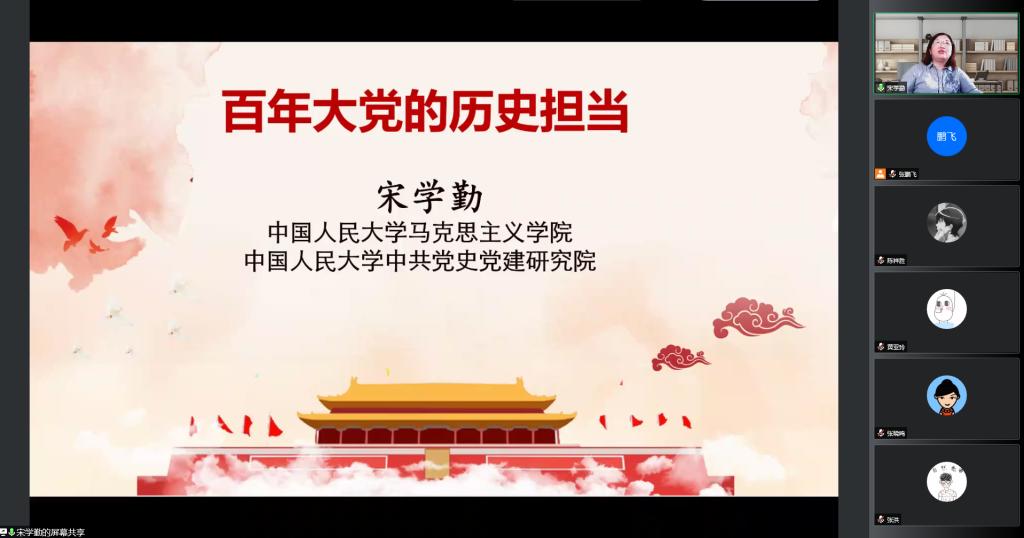 8月24日,我支部邀请中国人民大学马克思主义学院宋学勤教授给教师学生党员做了题为《百年大党的历史担当》的报告。报告会采用腾讯会议线上进行。