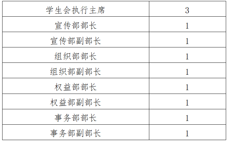 (1)学生会主席团实行执行制,主席团成员共三人,学代会得票最多者为上学期执行主席,次者为下学期执行主席,再次者为主席;