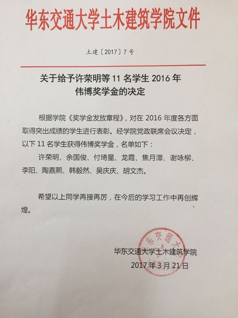 2016中铁七局奖学金名单