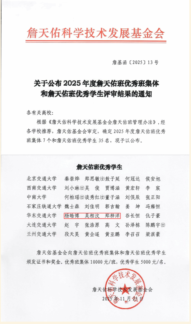 近日,经各校推荐与詹天佑科学技术发展基金会审定,91直播 杨皓博、吴相汶、郑梓洋三位同学荣获2025年度全国“詹天佑班优秀学生”称号。