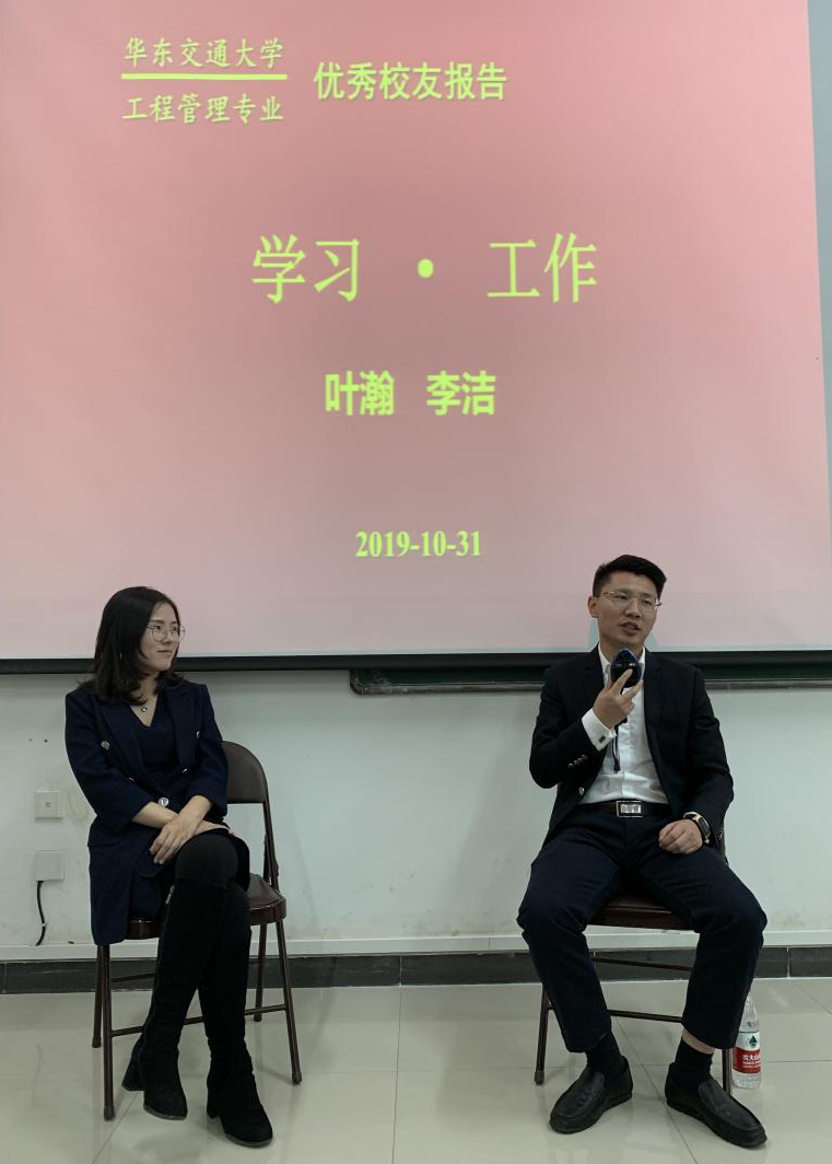 报告会上,叶瀚、李洁结合自身学习和工作的经验,用通俗的语言深刻阐释了工程管理专业内涵,认为工程管理专业是房地产行业里极为重要的专业。他们向学弟学妹们指出,在学习、工作的道路上需多一些自信,需具备自强不息、持之以恒的精神,需保持吃苦耐劳、诚实守信的优良品质,同时需怀有一颗感恩之心,懂得回报社会。