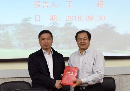 9月30日,校长罗玉峰向中国工程院院士王超教授颁发了我校日新客座教授证书。王超院士还受邀来校做“科学谋划、质量提升、发展跨越”学术报告。副校长史焕平教授主持。