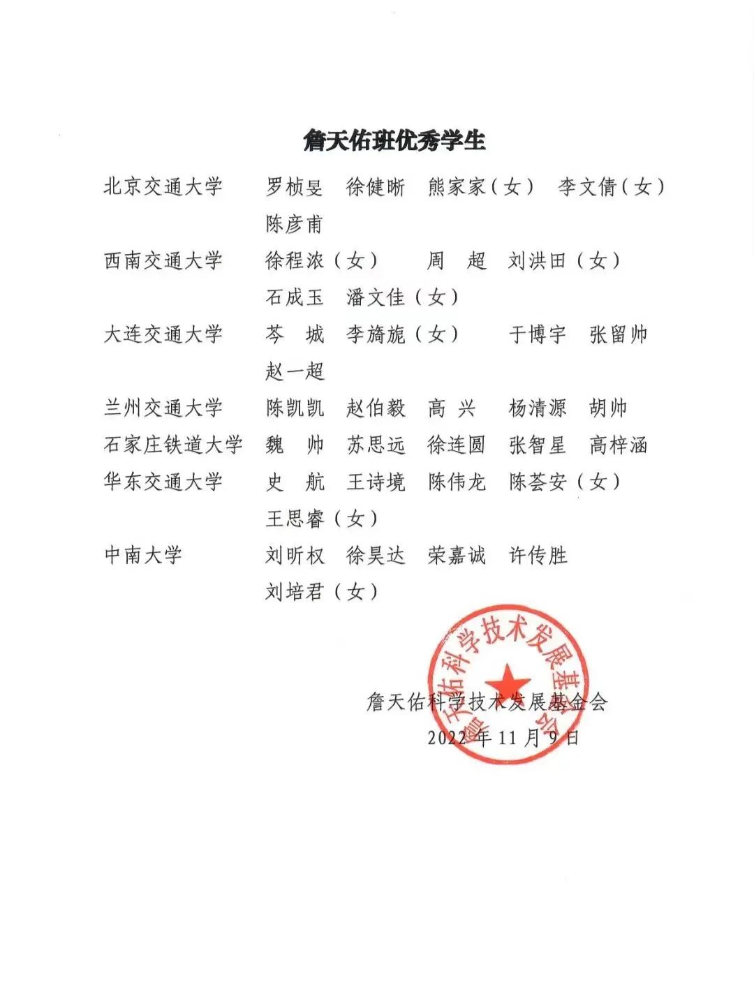 根据詹天佑科学技术发展基金会《詹天佑班管理办法》,经各学校推荐,詹天佑基金会秘书处审定,确定2022年度奖励詹天佑优秀班集体7个、詹天佑奖学金获得者35名。91直播 2020级土木(城轨詹天佑)班获评2022年度詹天佑班优秀班集体,史航、王诗境、陈伟龙三名同学获评2022年度詹天佑班优秀学生。