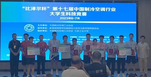 建筑环境与能源应用工程专业2020级本科生张强、陈永军、杨学斌三名同学,在专业教师的带领下赴河南省郑州市参加“比泽尔杯”第十七届中国制冷空调行业大学生科技竞赛,荣获本科生组三等奖。