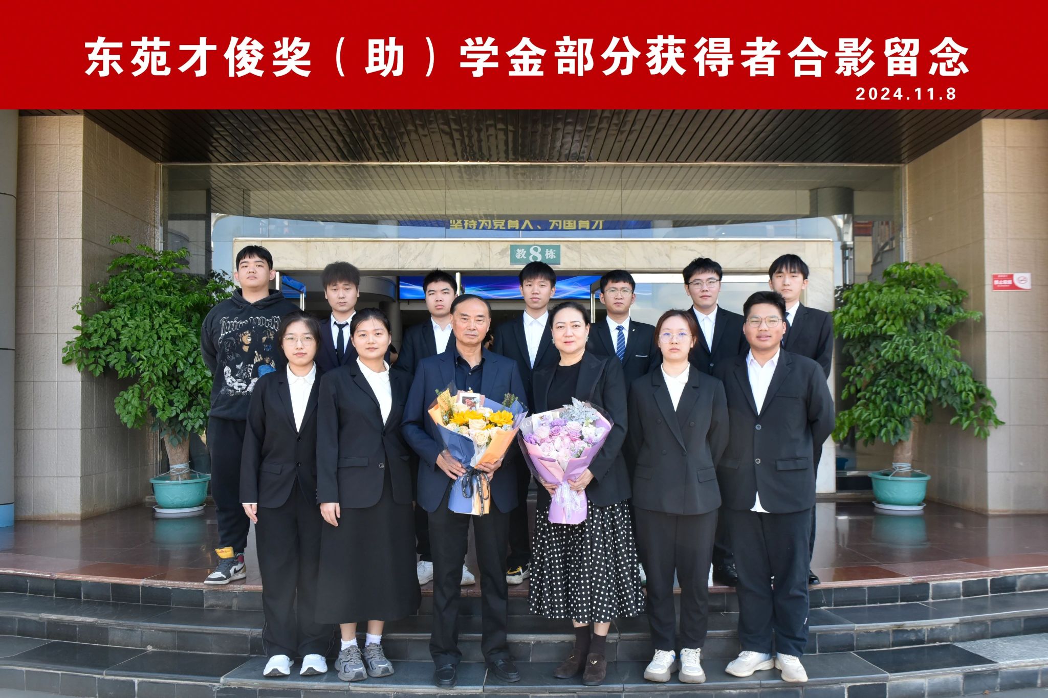 荣获“东苑才俊奖(助)学金”的学生代表给侯抗胜董事长和何红萍校友献花,表达感恩之情。