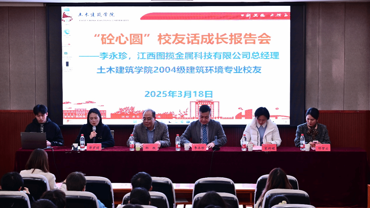 邀请2004级建环专业校友、江西图揽金属科技有限公司总经理李永珍,在教9栋200报告厅举行“砼心圆”校友话成长报告会。江西图揽金属科技有限公司综合部经理宋利娟、销售部经理邓梦云,土建学院党委副书记郑轶、学工办主任万雯怡及2024级学生代表参会,报告会由学工办副主任华罗娟主持。