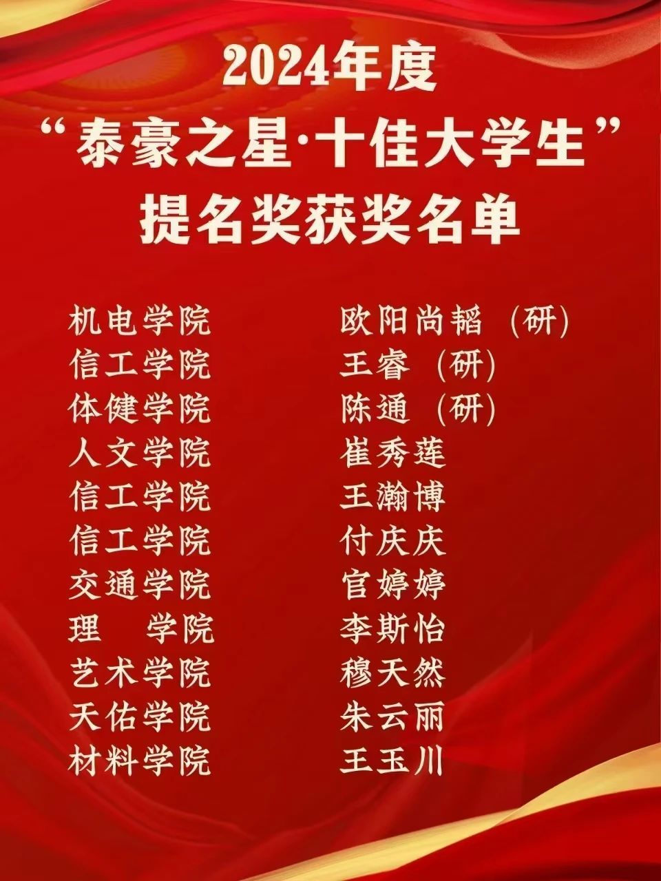 评委根据选手现场三个环节表现打分,综合赛前赴泰豪集团交流实践表现,评选出2024年度“泰豪之星·十佳大学生”10名,“泰豪之星·十佳大学生”提名奖11名。