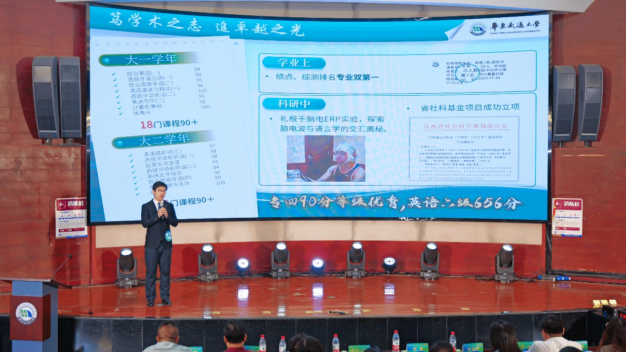 泰豪集团创始合伙人、董事会副主席李华讲话。他首先对21位候选人的优秀事迹和精彩表现表示肯定,同时高度评价了学校的育人成果。他向师生介绍了泰豪集团的发展情况和人才培养模式。他表示,期待与学校开展更多合作,也诚挚欢迎优秀的华交学子加入泰豪,实现自我价值,创造社会价值,共同为助力江西打造“三大高地”、实施“五大战略”,奋力谱写中国式现代化江西篇章添砖加瓦。
