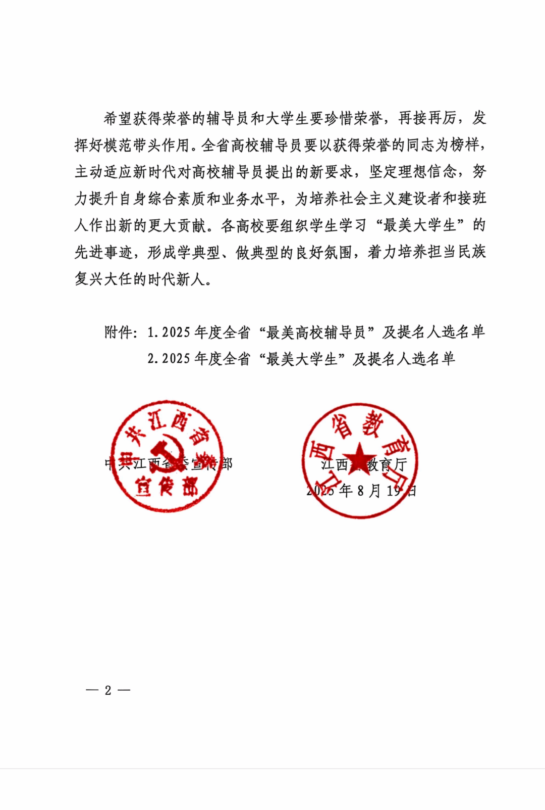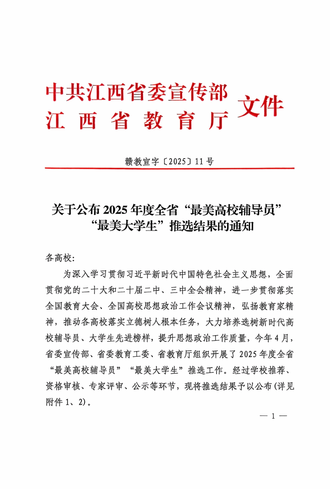 近日,中共江西省委宣传部和江西省教育厅联合发文公布2025年度全省“最美高校辅导员”“最美大学生”推选结果,91直播
